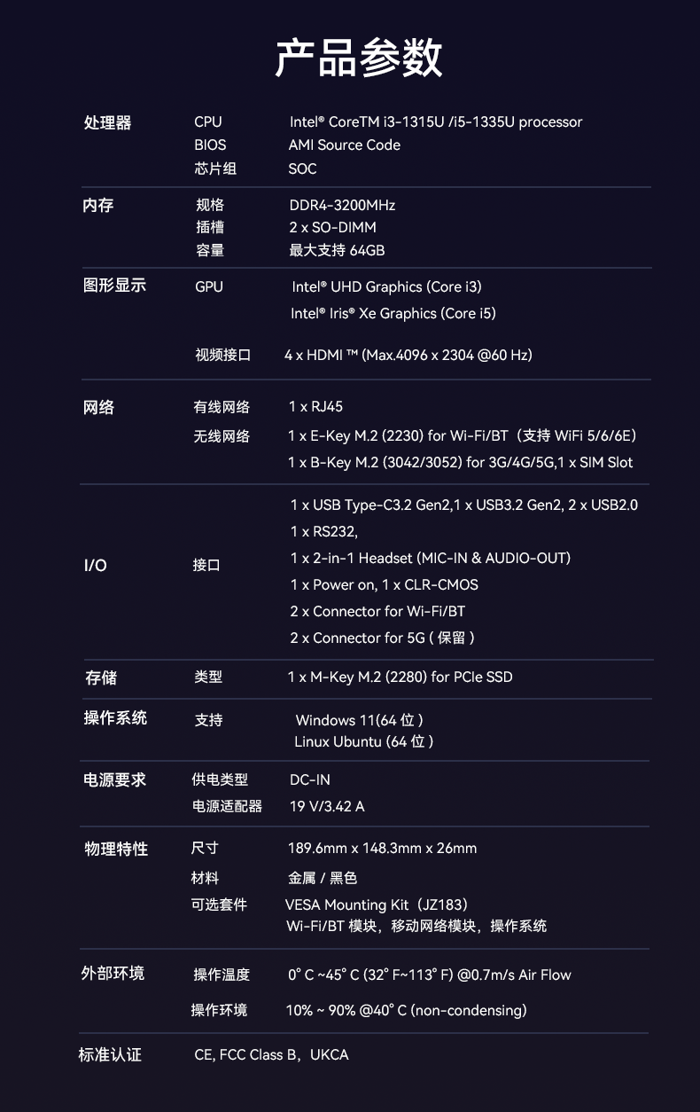 CA88(中国区)科技D613采用英特尔Raptor Lake酷睿i3-1315U/i5-1335U 处理器,作为一款性能强悍的主机,它的TDP仅15W,能有效降低能耗,延长电池寿命。在内存方面,D613采用2 x SO-DIMM DDR4-3200 MHz,最大可达64GB,并配备1 x M-Key M.2 (2280) for PCIe SSD。