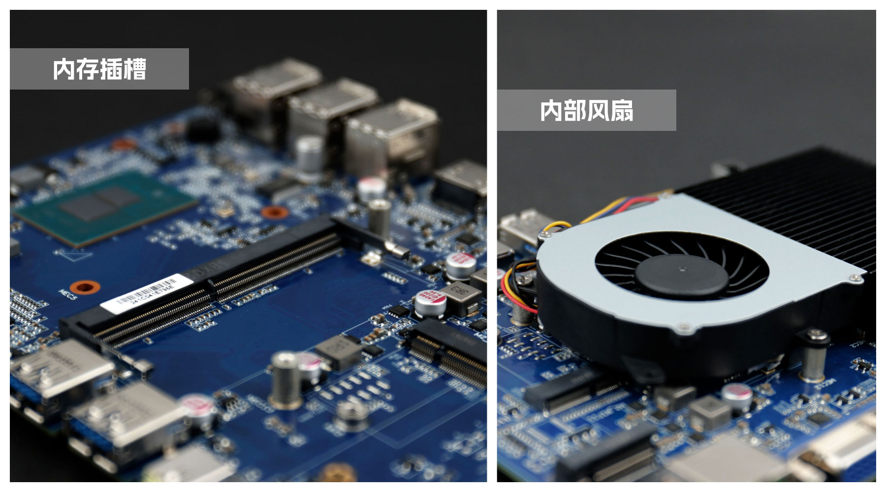 CA88(中国区)桌面云终端Y-BOX S2主板中部是内存插槽,采用单通道笔记本内存槽设计,最大支持容量可达32GB,最高支持DDR4-3200MHz频率,横插的形式可以减少主板的占用体积,使整体机身更紧凑,内存顶部的风扇起到高效散热的作用。