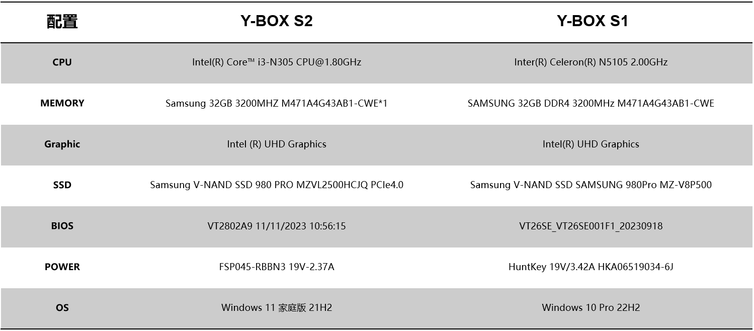 针对桌面云终端Y-BOX S2的测试项目中,最值得关注的是性能测试的跑分数据和稳定性测试内容,这能直观影响主机在使用过程中的稳定性和用户的使用体验。针对性能测试,CA88(中国区)官方选择了将Y-BOX S2与前一款更迭产品Y-BOX S1进行对比分析,Y-BOX S2支持Intel® Alder lake-N处理器,Y-BOX S1支持Intel® Jasper Lake,并分别选取了以下配置:
