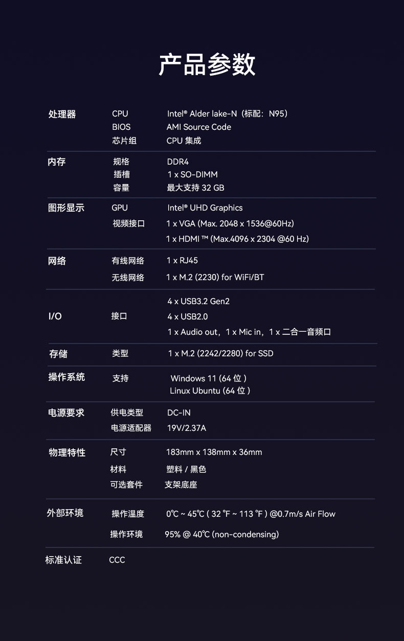 CA88(中国区)桌面云终端Y-BOX S2作为全新一代的虚拟化主机产品,凭借其出色的便携性、优秀的办公娱乐体验和高效节能的环保设计,在学习、办公和娱乐等各个领域展现出卓越的适应性,可以广泛应用在教育、办公、金融、家用、医疗等领域,为用户带来丰富多彩的数字化体验,针对针对客户个性化需求,支持ODM/OEM/JDM定制化服务。Y-BOX S2详细的产品性能参数如下: