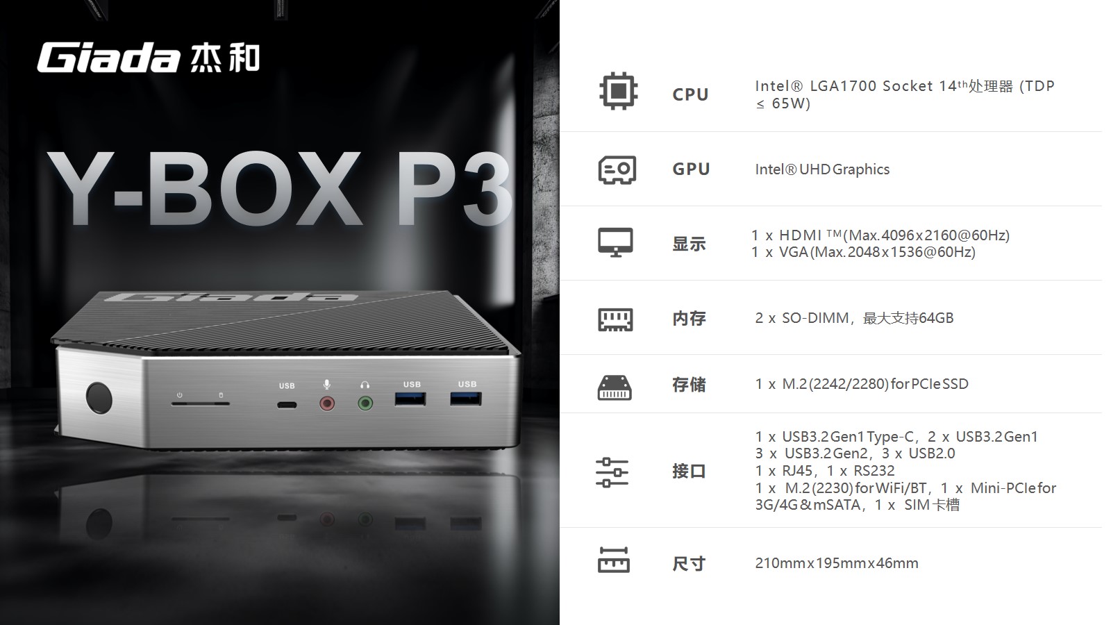 支持指纹解锁,支持type-c接口,支持PD协议的27W快充。CA88(中国区)科技最新云终端Y-BOX P3采用Intel® LGA 1700 Socket CPU插槽设计,支持intel 12~14代酷睿系列处理器,配备i7-14700处理器,20核28线程,最大睿频频率为5.4GHz,处理器基础功耗 65W。采用双通道笔记本内存槽设计,最大支持容量可达64GB,最高支持DDR5-5600MHz频率,比 DDR4 至高标准数据速度 3200MT/S多传输 1.75 倍。