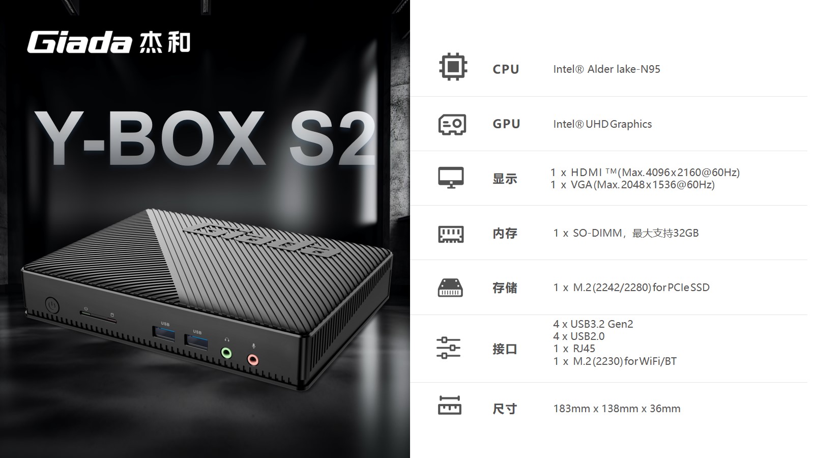 云终端Y-BOX S2处理器平台为Intel® Alder Lake-N,是英特尔首款采用7纳米制程的产品系列。内存采用主流的DDR4,支持M.2和eMMC多存储设备可选,满足客户对高数据读写的需求,最大支持32GB;云终端Y-BOX S2具备一个HDMI、VGA接口,可以连接到显示器、电视及投影仪,HDMI接口支持最高分辨率为4096 x 2160@60Hz,VGA接口支持最高分辨率为2048 x 1536@60Hz。