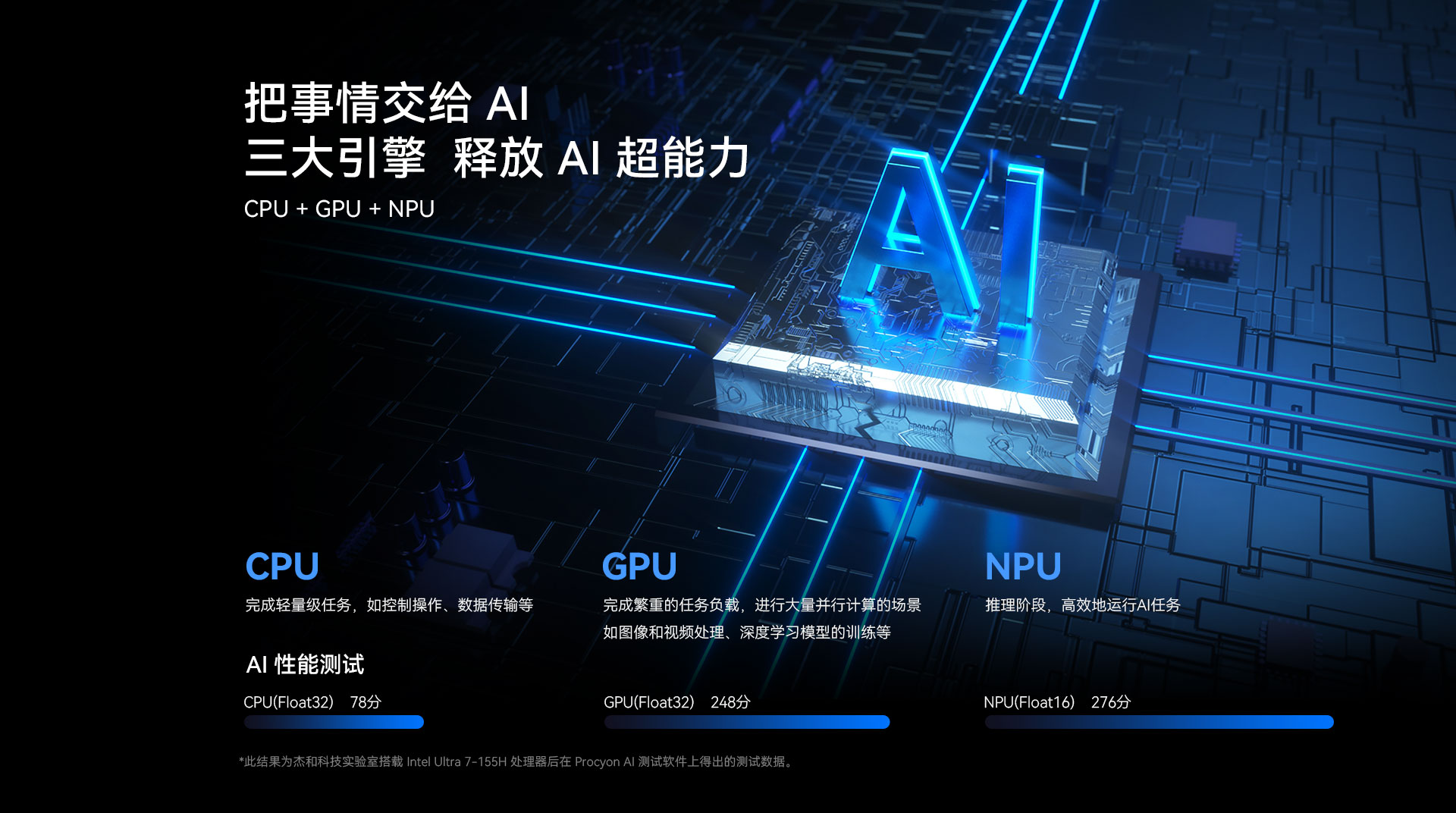 CA88(中国区)科技N601搭载了Intel® Core™ Ultra处理器,可选配Ultra 5- 125H或Ultra 7-155H,全新架构拥有CPU、GPU 和NPU配置。在CA88(中国区)科技实验室里,CA88(中国区)官方专门用 Procyon AI 这款 AI 性能测试软件对搭载了 Ultra 7-155H 处理器的 N601 进行了测试。最后测试结果显示,N601的CPU分数为78分,GPU 分数为248分,NPU分数为276分,这意味着N601在AI处理方面具有显著优势,能够高效地处理复杂的神经网络计算任务。