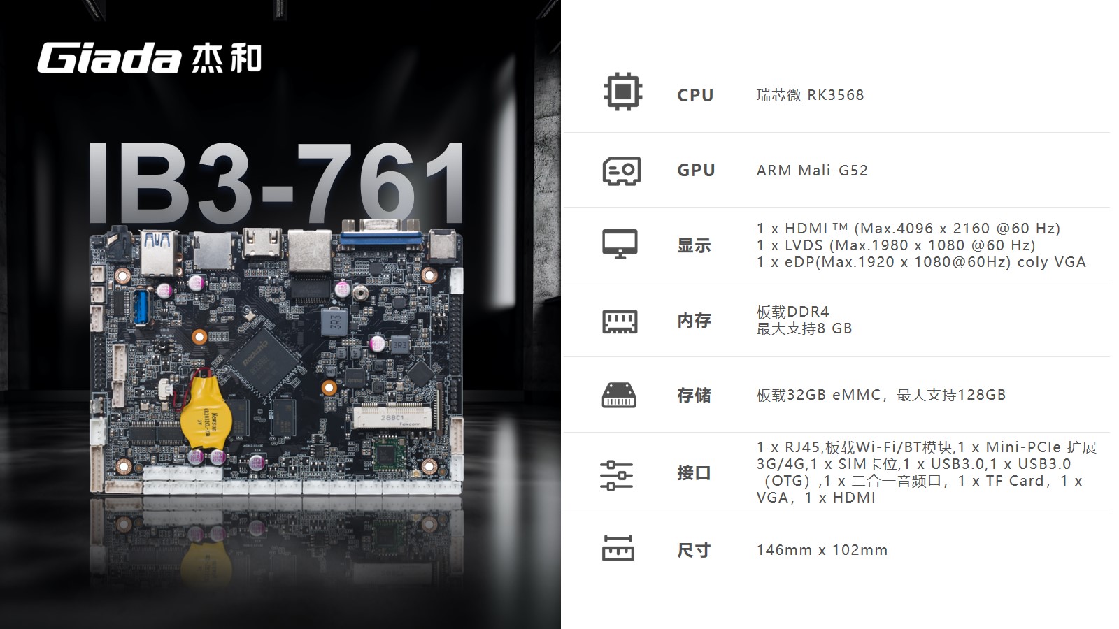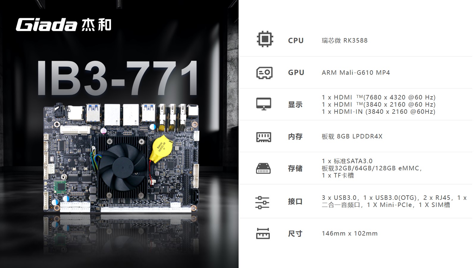 本次CA88(中国区)科技高交会展示的工业计算机主板IB3-771、IB3-761,搭载了Rockship的芯片,可应用于工业自动化、物联网解决方案和汽车系统,已经被多数客户部署在工厂车间以及物联网生态系统的智能设备中。