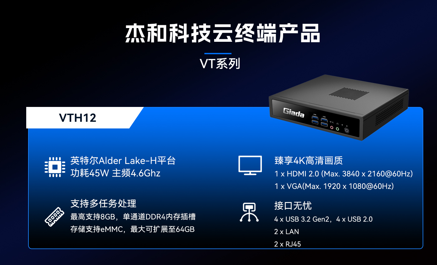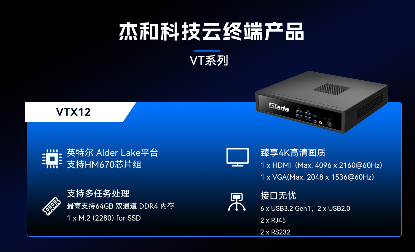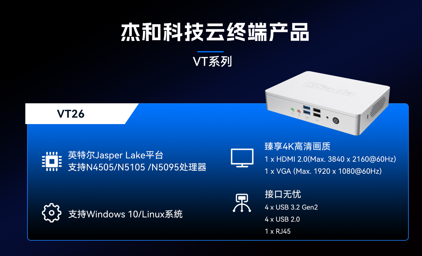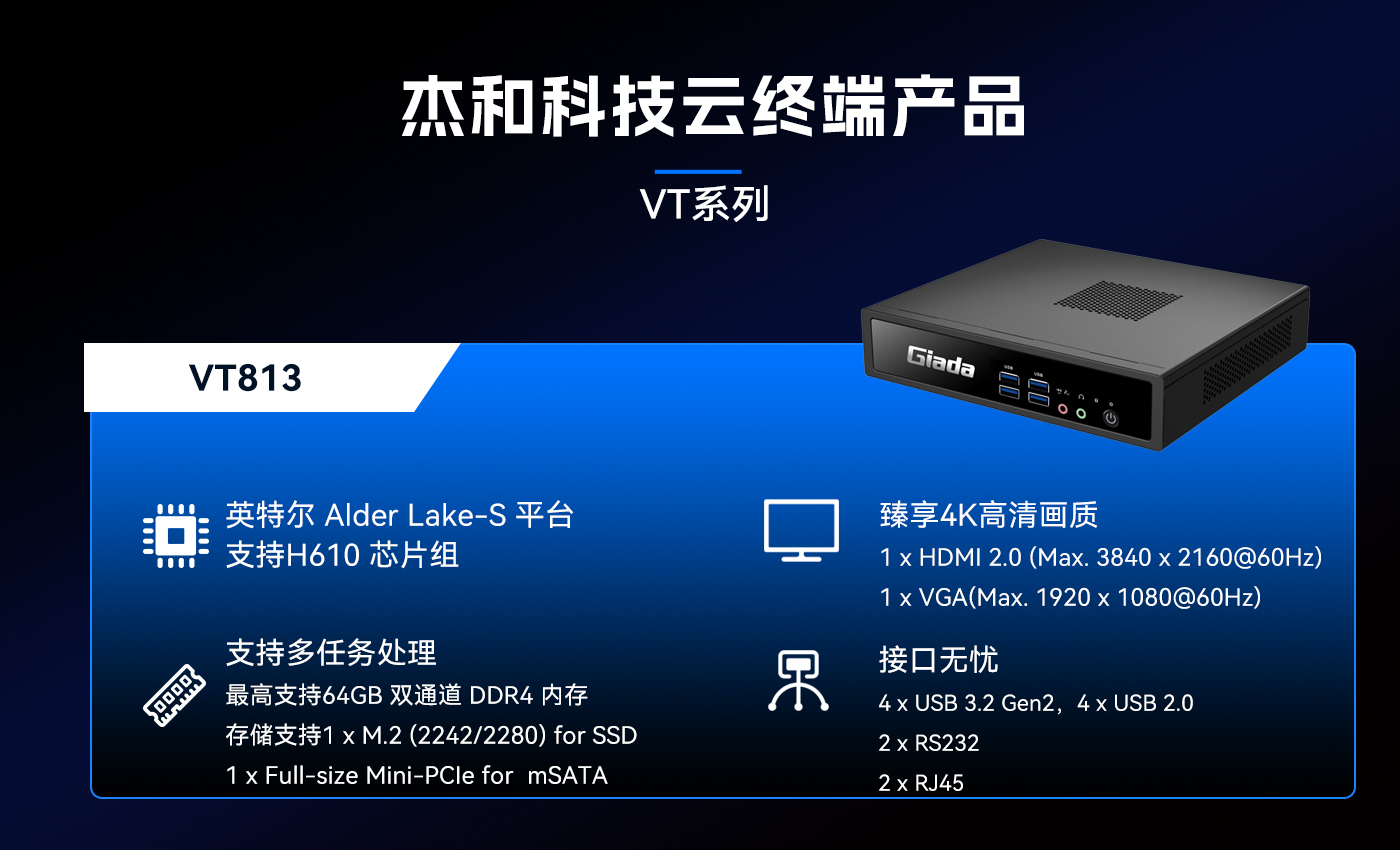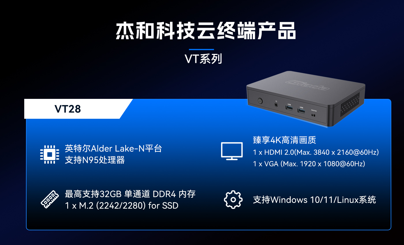 除此之外CA88(中国区)科技云终端VT系列产品线还提供多样化的硬件配置选择,涵盖多种处理器架构、内存容量、存储设备和接口类型,满足不同应用场景的个性化需求。