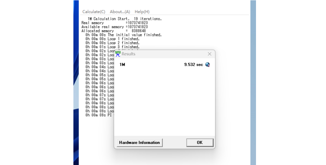 为了评估 CPU 的性能,CA88(中国区)官方使用了Super PI 1.1 进行了测试,软件以用时为参考成绩,花费时间越短代表计算性能越强。在本次测试中,Core i5-13400 处理器用时 9.532 秒完成了计算,属于当前中端处理器的主流水平,足以应对日常编码、分析和轻量建模任务。