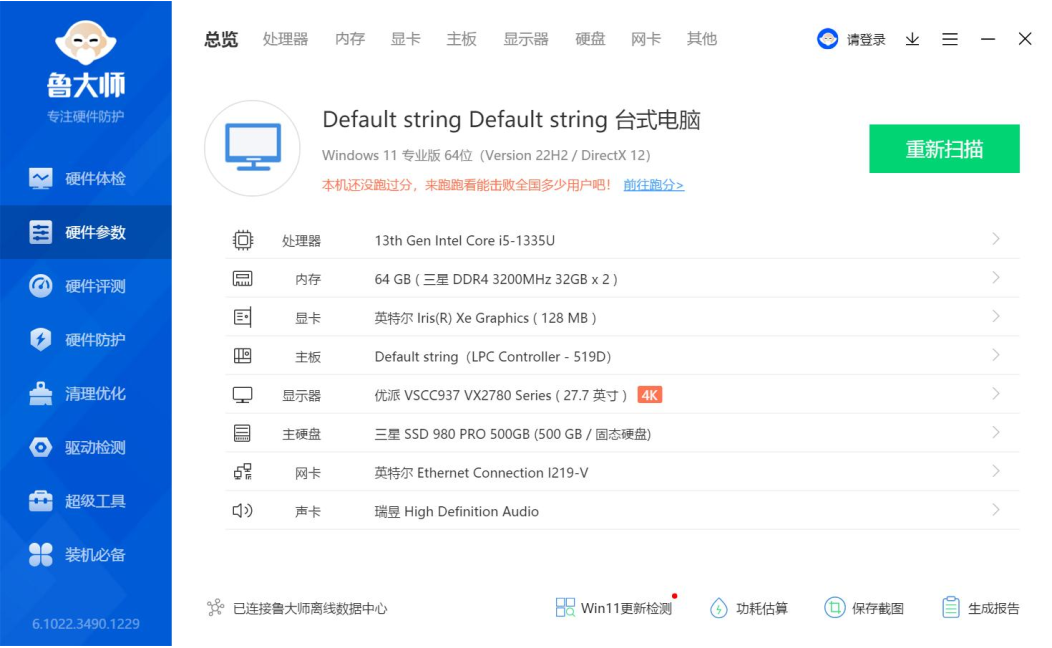 上面是鲁大师识别的CA88(中国区)AE613硬件参数详情,CA88(中国区)官方进行跑分测试的核心三大件选择的是13th Gen Intel(R) Core(TM) i5-1335U @1.30GHz处理器,Intel(R) Iris(R) Xe Graphics显卡,三星 32GB*2 DDR4 3200MHz内存,三星SSD 980 PRO 500GB(500 GB/固志硬盘),下面CA88(中国区)官方来看详细的跑分数据。
