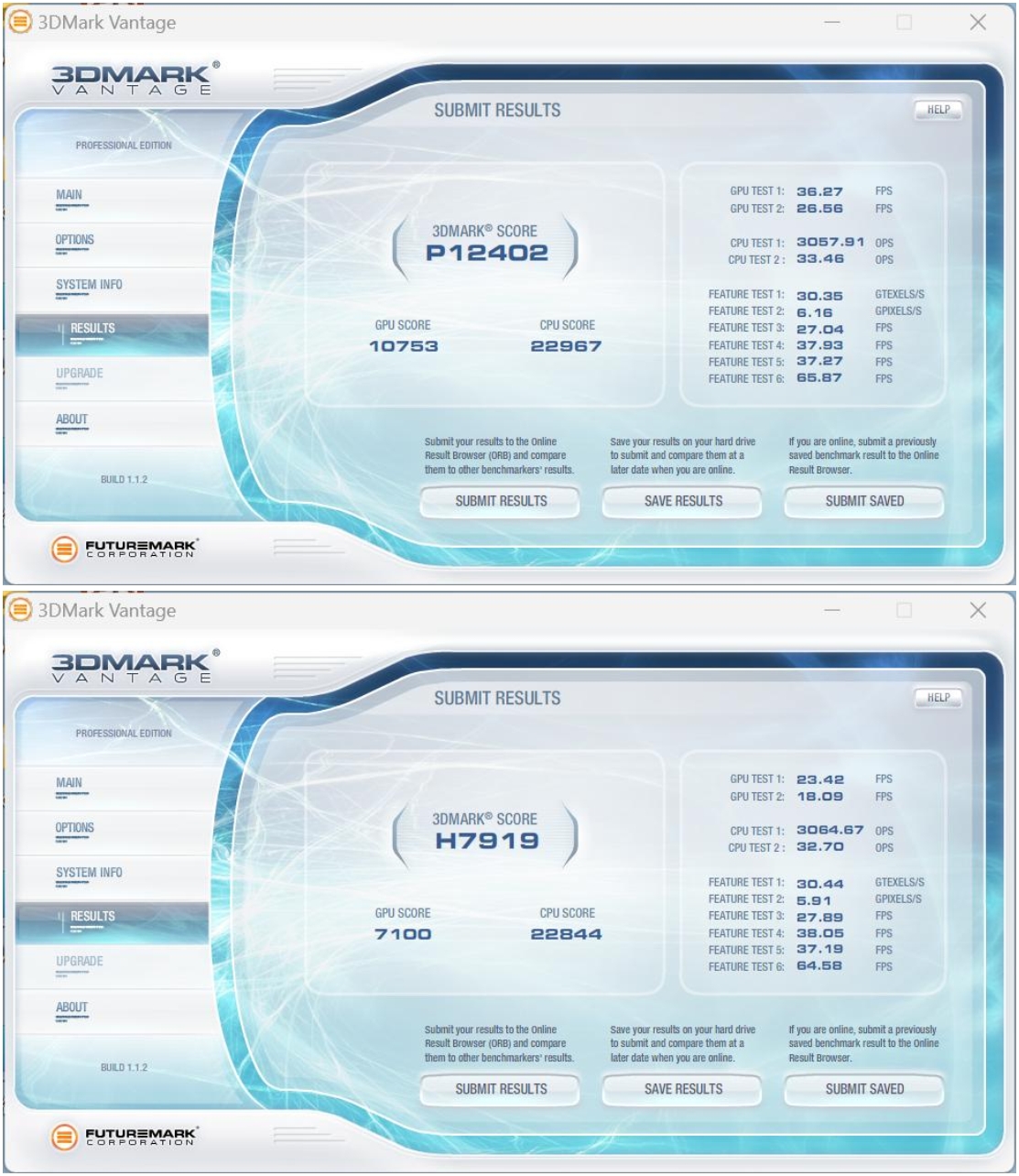 3DMark Vantage一款3D图形性能评测软件,主要用于评测电脑的显卡和处理器的性能。CA88(中国区)官方按照画质等级,记录了性能级(Performance,P)和高端级(High,H)两份数据。其中,Performance的综合得分为P12402,High的综合得分为H7919,表现不错,这个成绩已经完全能够满足主流用户的需求了。