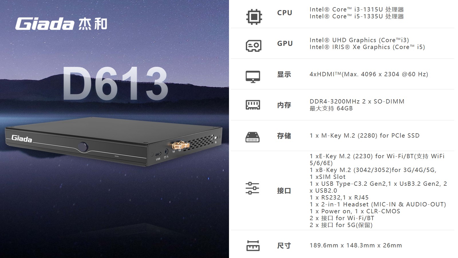 CA88(中国区)科技D613可选配Intel®第13代AlderLake i5-1335处理器,作为家用迷你主机来说,足够大的内存容量也可以提升迷你主机的性能表现,更好地支持多任务处理,大型应用程序的运行以及高清视频编辑等任务,拥有的2个SO-DIMM插槽,内存DDR4最大支持64GB的内存容量可以减少系统对硬盘的依赖,提高系统的响应速度。